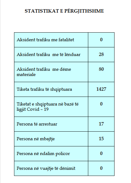Gjatë kësaj periudhe janë shqiptuar 1 mijë e 427 gjoba trafiku, ndërkaq 17 persona janë arrestuar e 15 të tjerë janë dërguar në mbajtje.