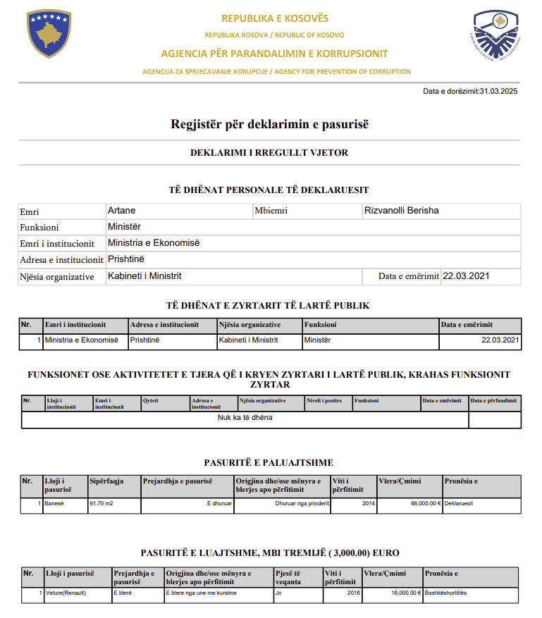 Rizvanolli ka deklaruar se ka një banesë 91.70 metra katrorë me vlerë prej 66 mijë euro, e dhuruar nga prindërit.