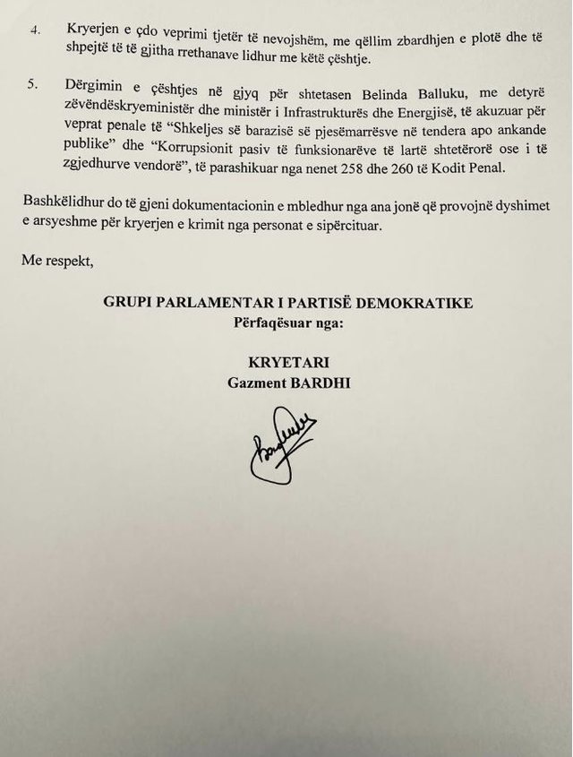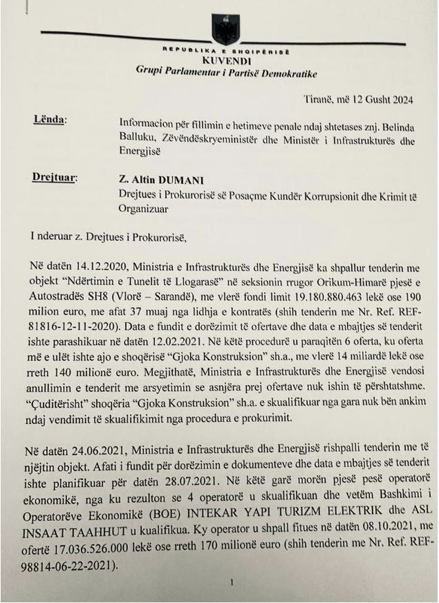Përmes kryetarit të tij Gazment Bardhi, Grupi Parlamentar i Partisë Demokratike, ka kallëzuar në SPAK zëvendëskryeministren dhe Ministren e Infrastrukturës e Energjisë, Belinda Balluku, e cila në bashkëpunim dyshohet se ka kryer veprat penale të“Shkeljes së barazisë së pjesëmarrësve në tendera, apo ankande publike” dhe “Korrupsionit pasiv të funksionarëve të lartë shtetërorë ose i të zgjedhurve vendorë”, të parashikuar nga nenet 258 dhe 260 të Kodit Penal.