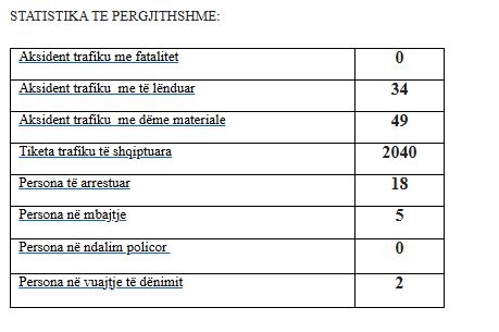 Sipas raportit, në këtë periudhë është nuk është shënuar asnjë aksident trafiku me fatalitet, ndërsa janë regjistruar 24 aksidente me të lënduar dhe 49 të tjera me dëme materiale.