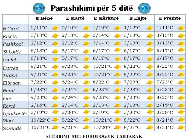 Ashtu siç po ndodh tashmë prej disa ditësh edhe për javën e ardhshme vendi ynë do të vijojë të ndikohet nga kushte të qëndrueshme atmosferike.