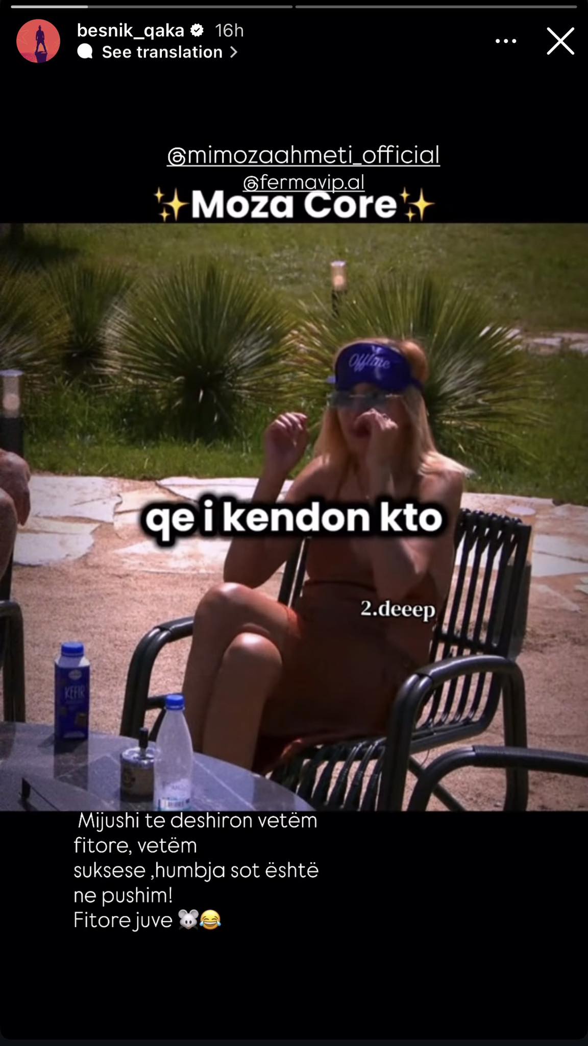 Megjithatë, për këngëtarin Besnik Qaka, ajo nuk ka ditur emrin dhe e ka quajtur “miush”. Pas kësaj deklarate, këngëtari ka reaguar duke shprehur mbështetjen e tij për të në “Ferma VIP”.