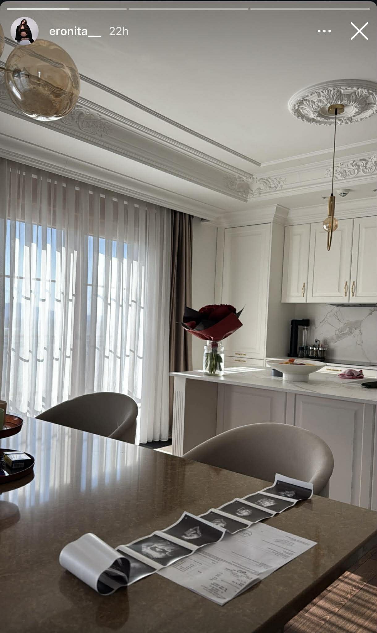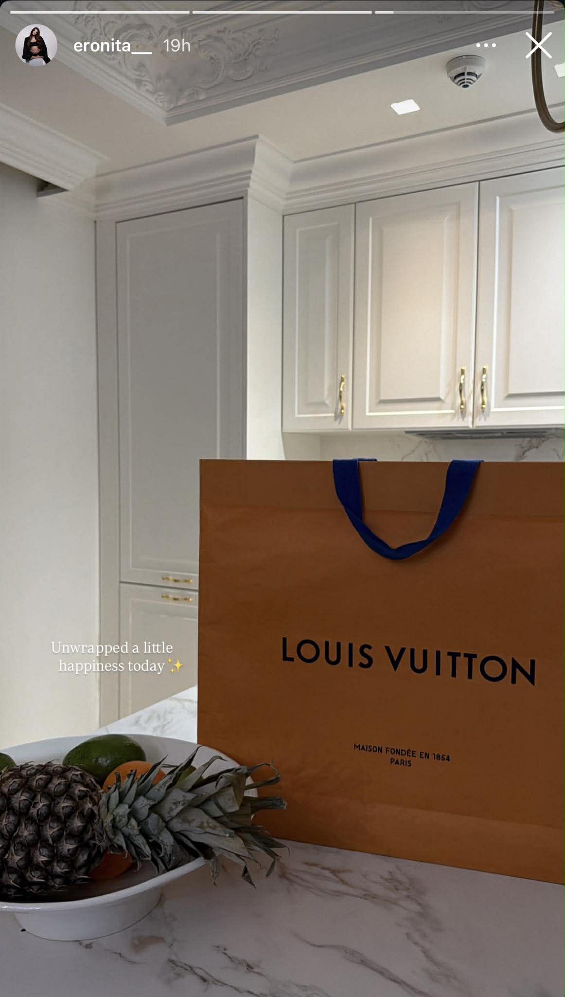 Në rrjetet sociale, Eronita publikoi gjithashtu imazhe nga ekzaminimet dhe më pas ndau një foto ku shihet një çantë me logon e markës luksoze Louis Vuitton.