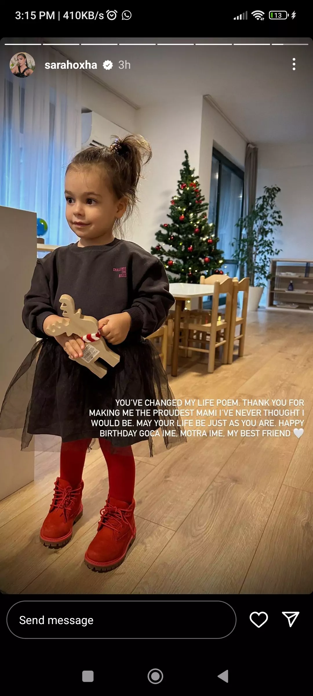 “E ke ndryshua jetën time Poem, faleminderit që më ke bërë mamanë më krenare, nuk e kisha menduar kurrë që do bëhesha. Shpresoj që jeta jote të jetë ashtu siç je ti, gëzuar ditëlindjen goca ime, motra ime shoqja ime e ngushtë”, shkruan Sara në InstaStory.
