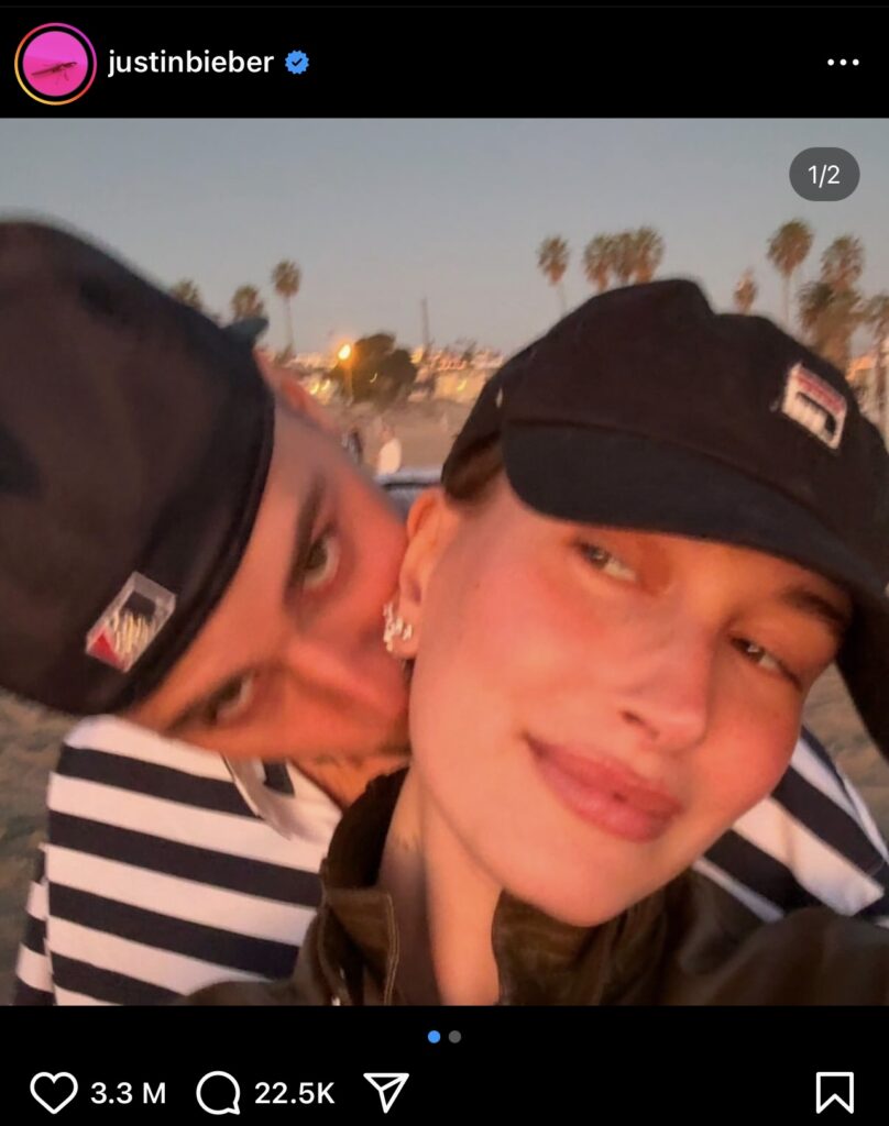 Në imazhin e publikuar, Justin qëndron pas Hailey-t, duke e puthur butësisht në qafë, ndërsa shikon kamerën me një vështrim të qetë. Hailey, ndërkohë, shfaqet e buzëqeshur dhe i drejton një vështrim plot admirim bashkëshortit të saj, ndërsa të dy shijojnë një perëndim dielli pranë shtëpisë së tyre në Los Angelos.