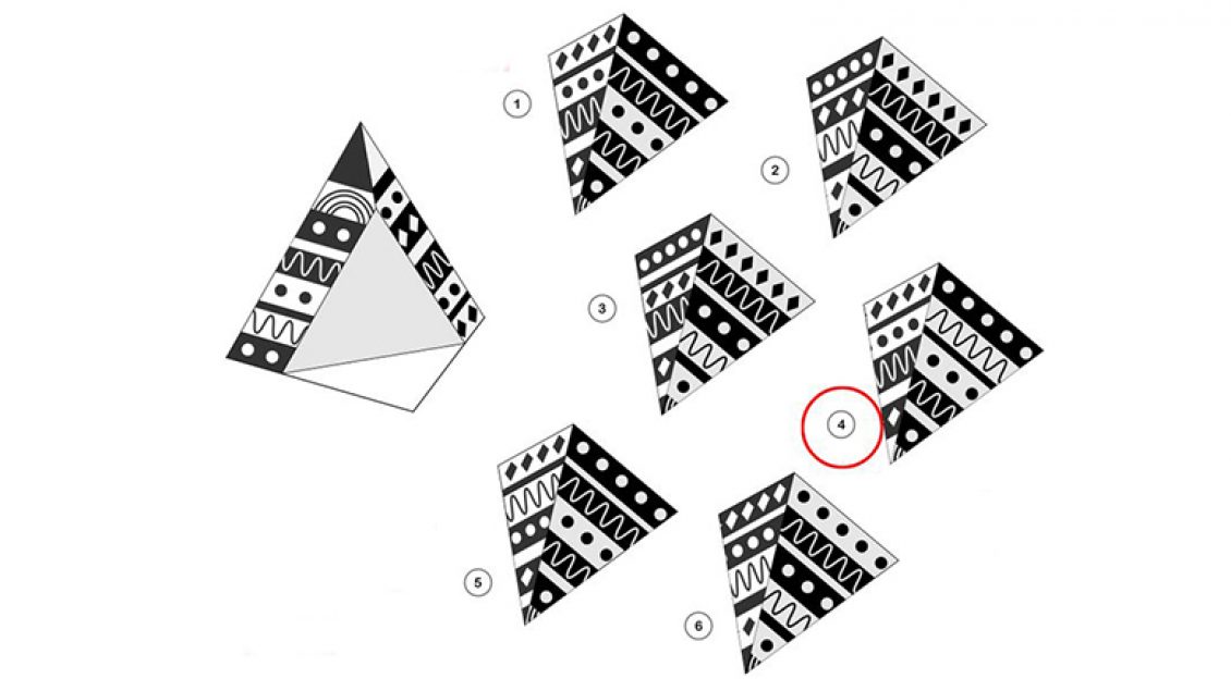 Pra, ilustrimi tregon një piramidë dhe gjashtë pjesë të ndryshme, vetëm njëra prej të cilave përshtatet në mënyrë të përkryer me të.