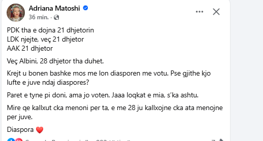 Aktorja dhe deputetja Adriana Matoshi ka bërë një reagim të drejtpërdrejtë në rrjetet sociale lidhur me debatin për datën e votimit të diasporës.