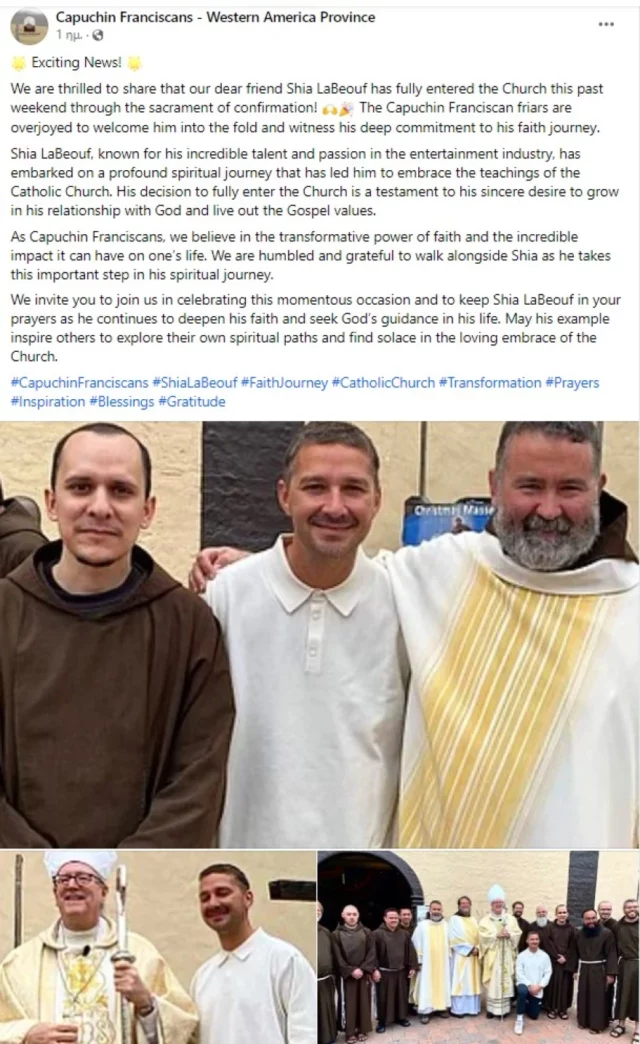 “Lajm emocionues! Jemi të emocionuar të ndajmë se miku ynë i dashur Shia LaBeouf hyri plotësisht në Kishë fundjavën e kaluar përmes aktit të vajosjes! Fretërit françeskanë janë shumë të gëzuar që e mirëpresin në kishën dhe dëshmojnë përkushtimin e tij të thellë në udhëtimin e tij të besimit.