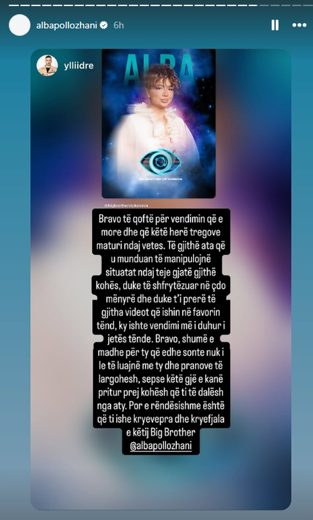 Në postimin e publikuar, Ylli e përgëzon Albën për vendimin e saj, duke theksuar maturinë dhe forcën që ajo tregoi gjatë rrugëtimit në shtëpinë më të famshme në Kosovë.