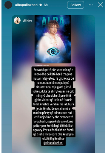 Në postimin e publikuar, Ylli e përgëzon Albën për vendimin e saj, duke theksuar maturinë dhe forcën që ajo tregoi gjatë rrugëtimit në shtëpinë më të famshme në Kosovë.