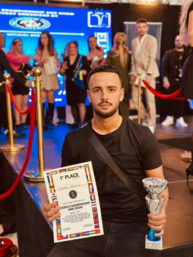 Por suksesi i tij nuk ndalet këtu. Së fundmi, Albiani ka marrë pjesë në “World Championship and Show” në Napoli të Italisë, një ngjarje prestigjioze që bashkoi shumë frizerë nga mbarë bota. Në këtë garë të nivelit të lartë, ai arriti të fitojë vendin e parë në kategorinë ku garoi, duke u shpallur kampion dhe duke sjellë një tjetër fitore ndërkombëtare për Kosovën.