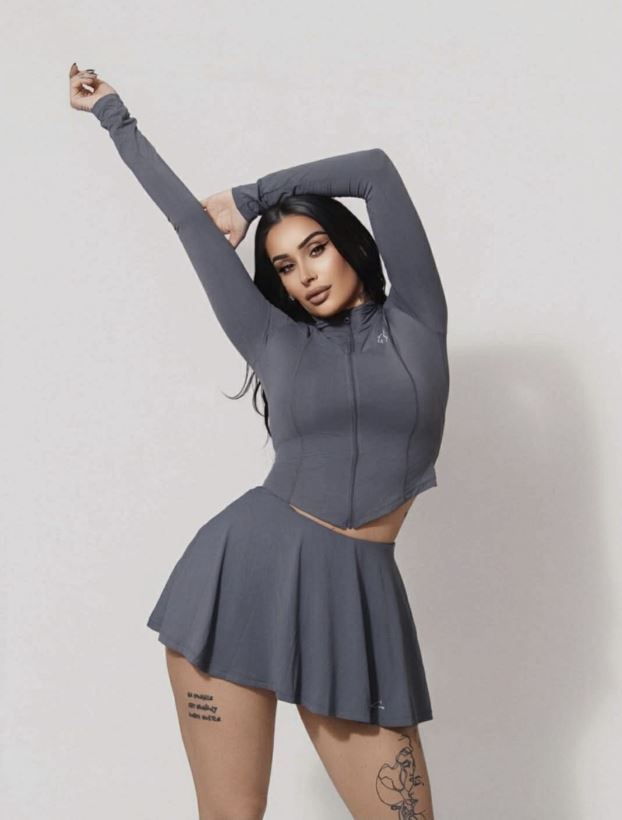 E veshur me fustan të shkurt, ajo vë në pah e saj trupore në formë.