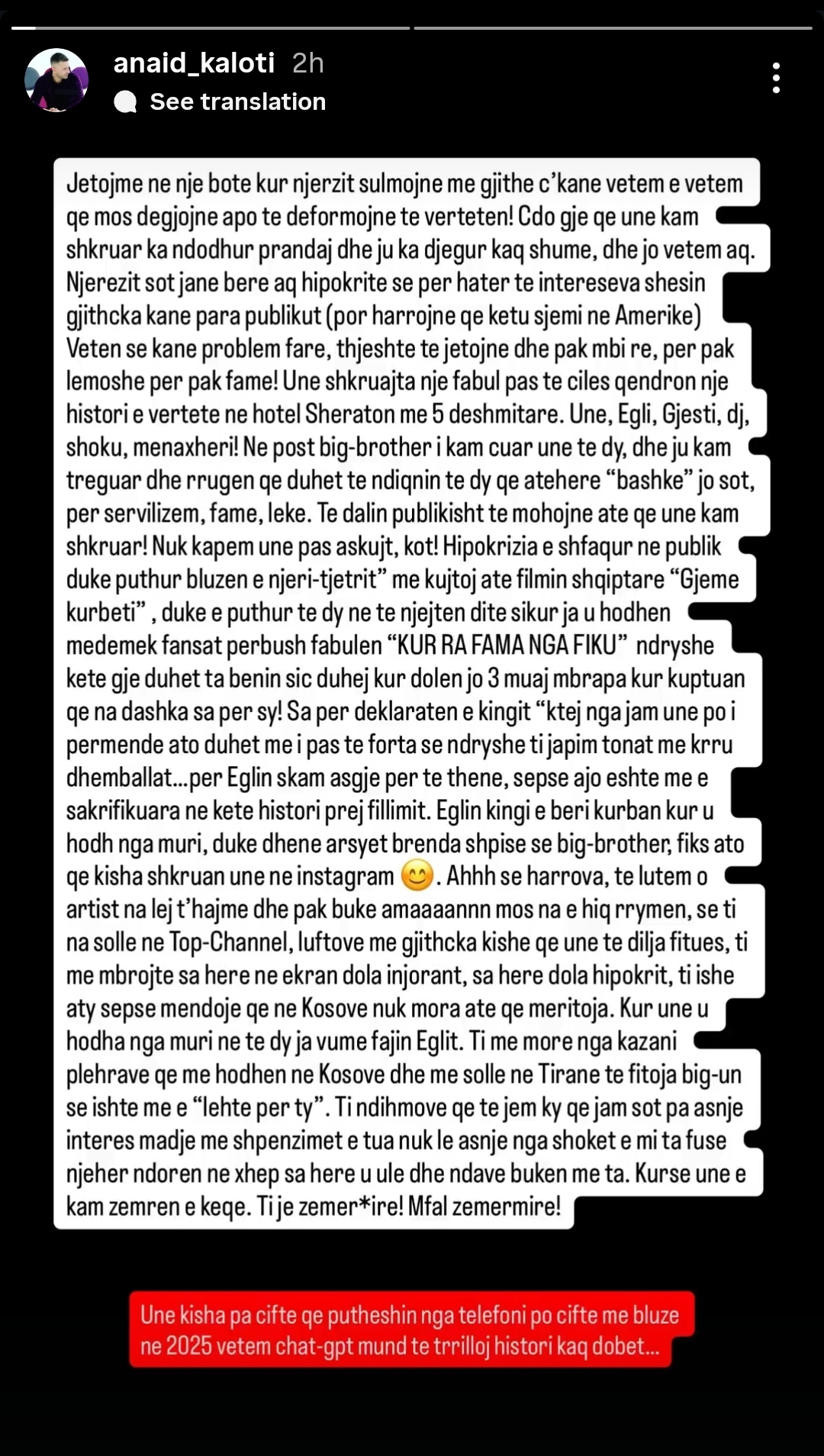 Anaid Kaloti, ka reaguar sot me një postim të gjatë e të drejtpërdrejtë në Instagram, ku shpërthen (sërish) ndaj dy ish-banorëve të BBVA4 – Gjestit dhe Eglit.