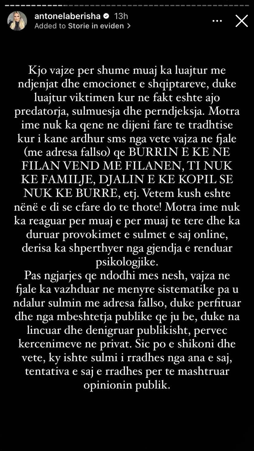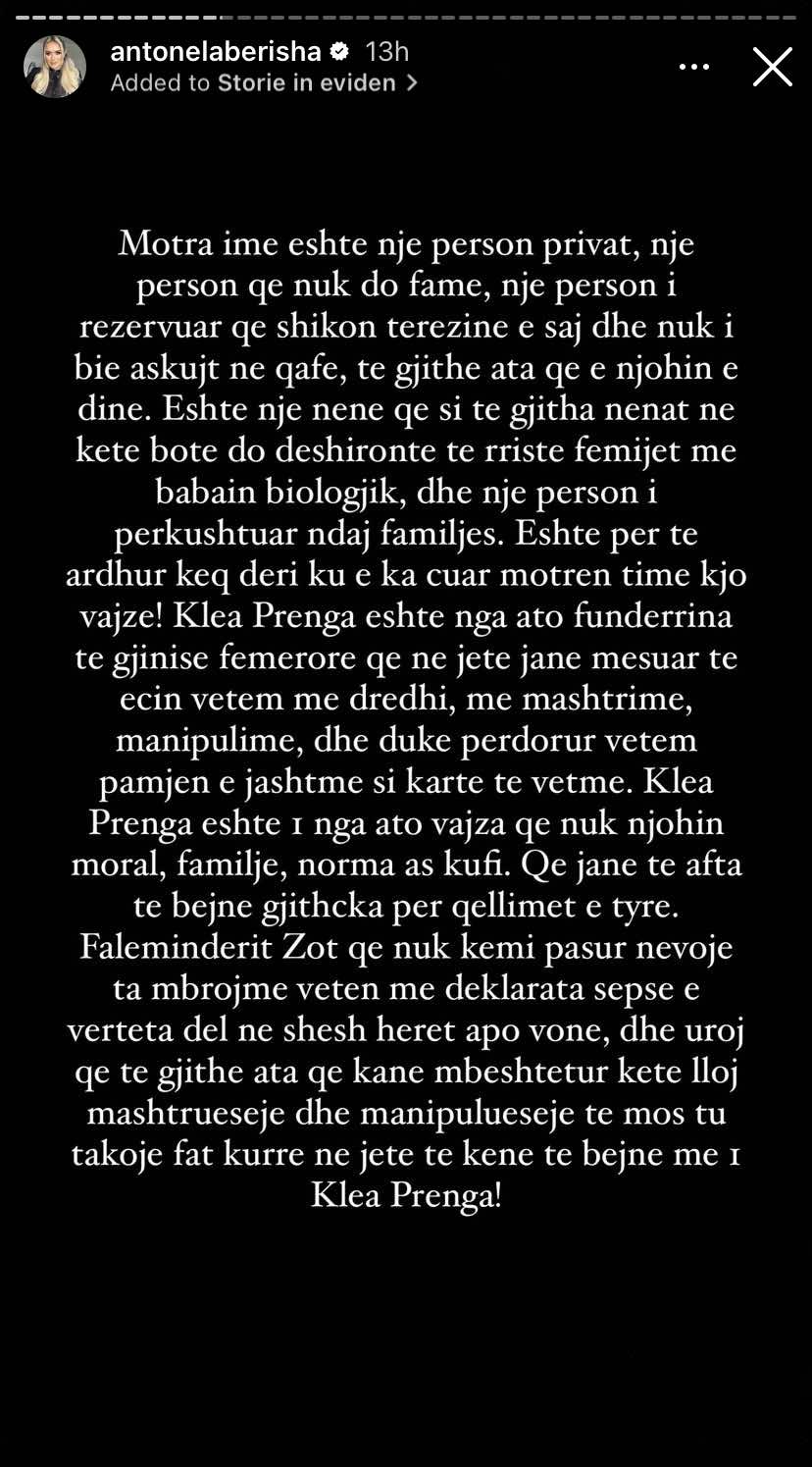 Ajo ka bërë një postim në rrjete sociale duke e demaskuar Klean ku tha se “Kjo vajzë për shumë muaj ka luajtur me ndjenjat dhe emocionet e shqiptareve duke luajtur viktimen, kur ne fakt është ajo sulmuesja dhe përndjekja, motra ime nuk ka qenë në dijeni fare të tradhtisë kur i kanë ardhur sms nga vet vajza në fjale me adresa fallto që burrin e ke në filan vend me filanen, ti nuk ke familje, djalin e ke kopil se nuk ke burrë”.