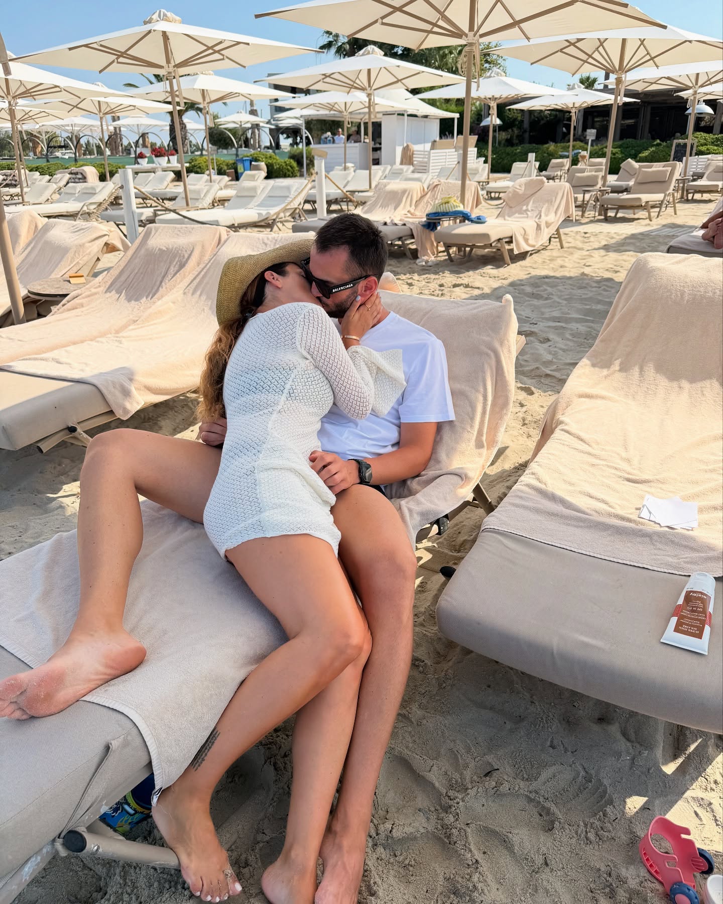 Të dy duken të relaksuar në një plazh luksoz, ndërsa nuk mungojnë përqafimet dhe puthjet romantike. Veshur me një veshje të bardhë plazhi dhe me kapele në kokë, Arbana rrezaton dashuri dhe lumturi.