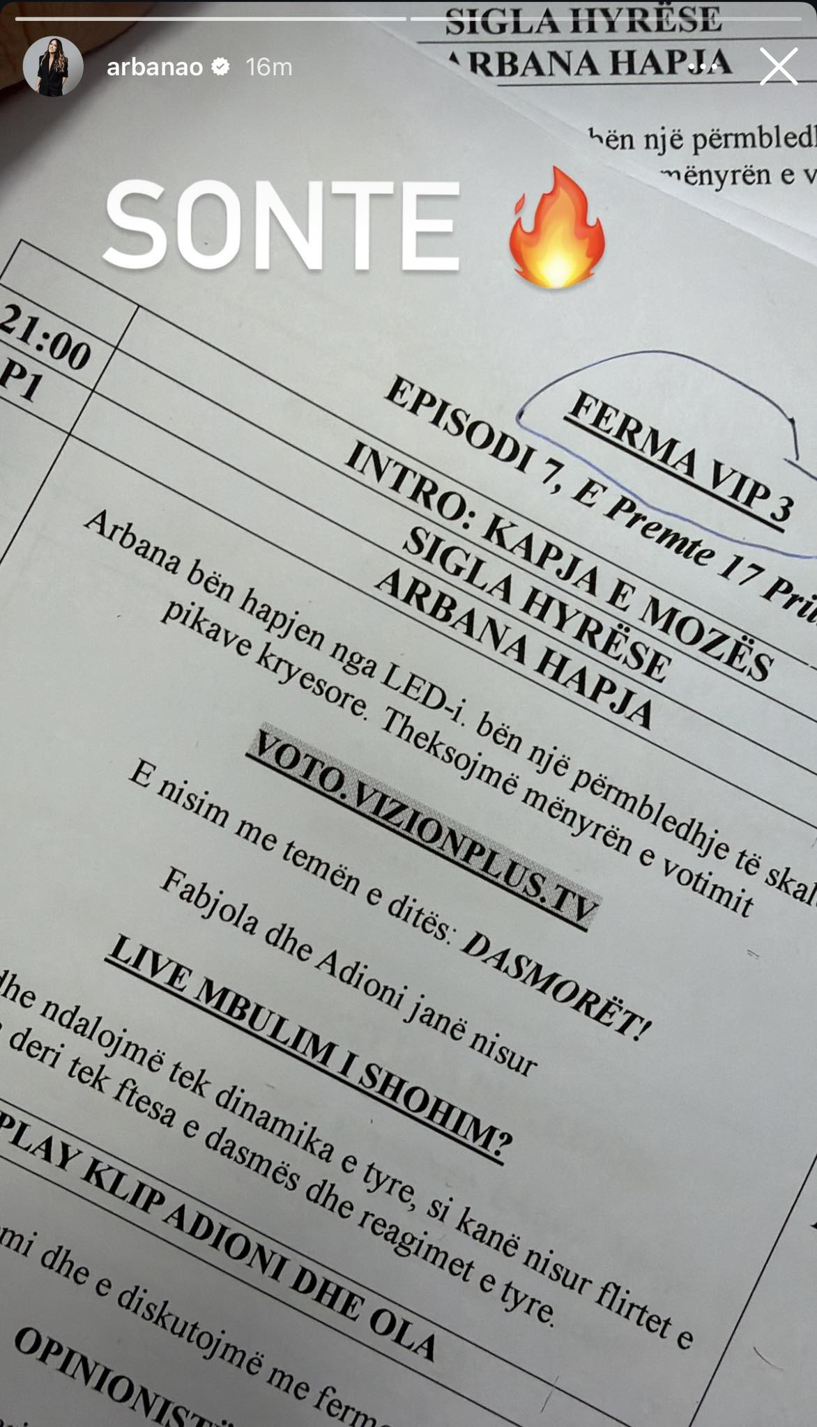 Prezantuesja Arbana Osmani ka ndarë në InstaStory një pjesë nga skenari i mbrëmjes së sotme të spektaklit “Ferma VIP”. Ajo ka dhënë një sinjal të shkurtër për zhvillimet që pritet të ndodhin gjatë natës, pa hyrë në detaje të mëtejshme.
