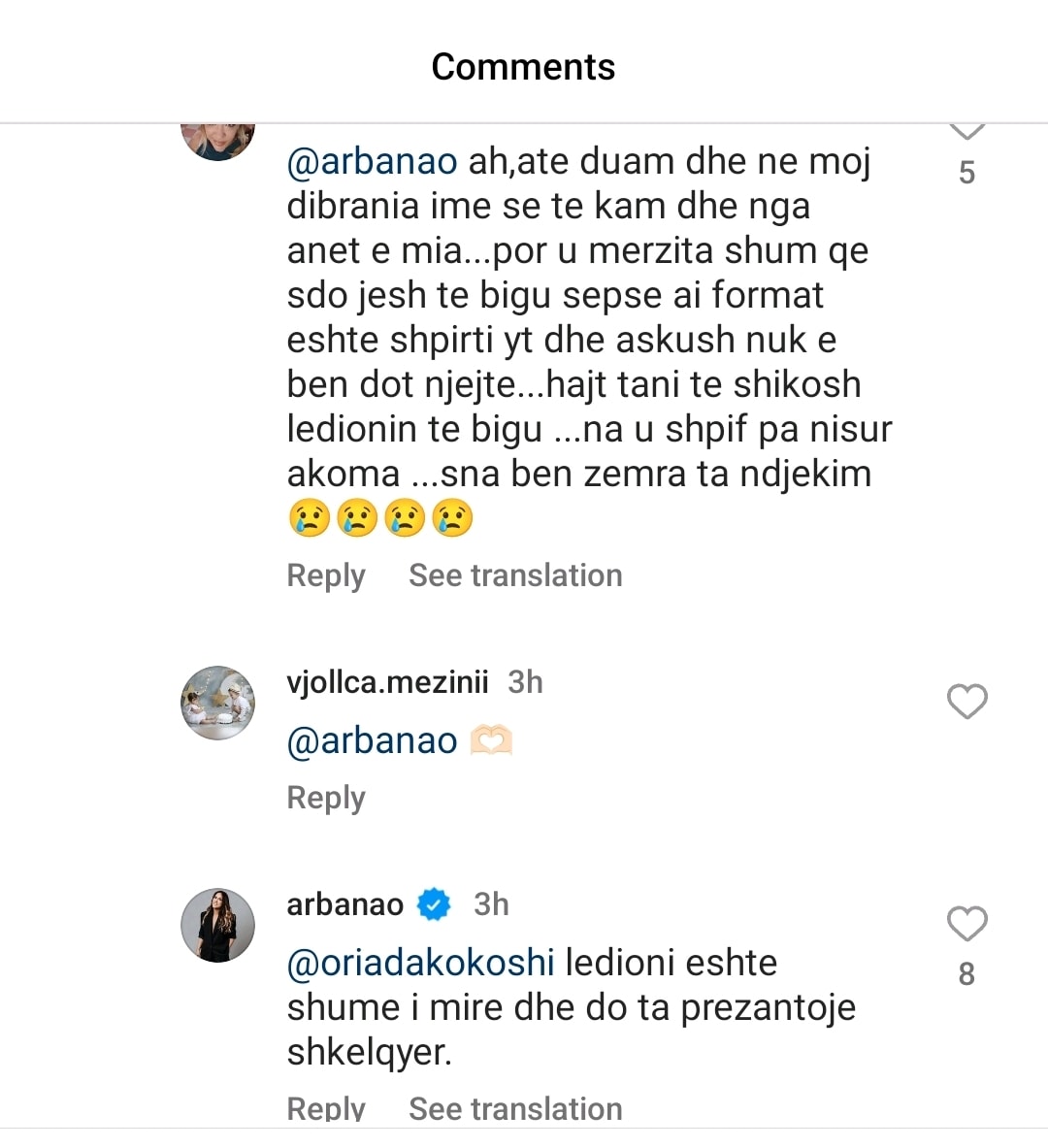 “U merzita shum qe sdo jesh te bigu sepse ai format eshte shpirti yt dhe askush nuk e ben dot njejte…hajt tani te shikosh ledionin te bigu…na u shpif pa nisur akoma…sna ben zemra ta ndjekim”, i shkroi ndjekësja.