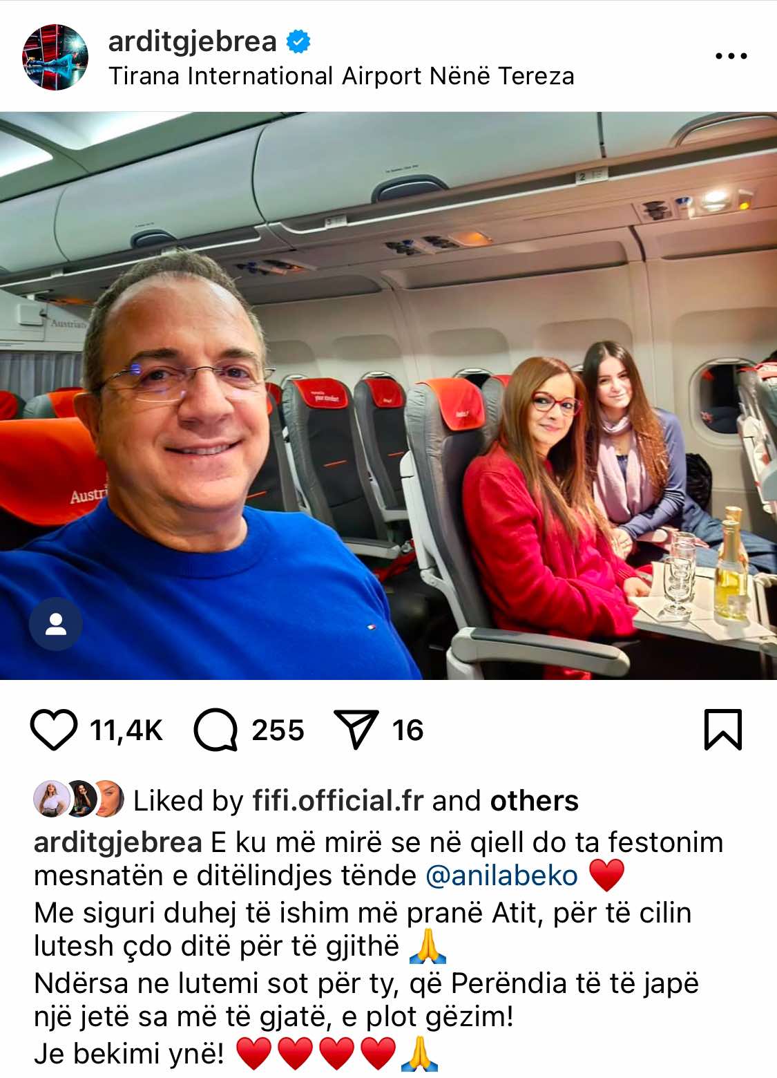 “E ku më mirë se në qiell do ta festonim mesnatën e ditëlindjes tënde @anilabeko. Me siguri duhej të ishim më pranë Atit, për të cilin lutesh çdo ditë për të gjithë. Ndërsa ne lutemi sot për ty, që Perëndia të të japë një jetë sa më të gjatë, e plot gëzim! Je bekimi ynë!” – ka shkruar Gjebrea në postimin e tij.