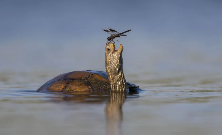 Tzahi Finkelstein ishte duke fotografuar zogj kur pikasi këtë breshkë uji që notonte në ujëra të cekët, teksa papritur një pilivesë u ul në hundën e saj.