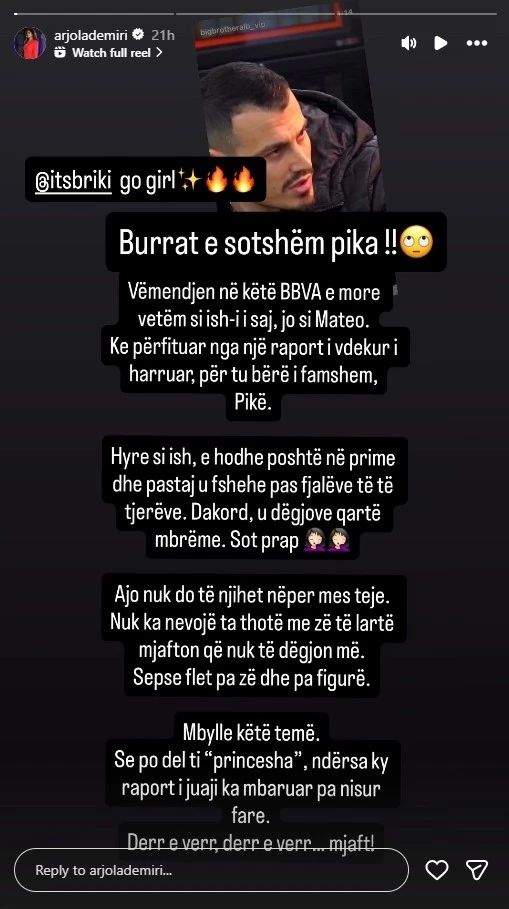 Arjola ka publikuar në InstaStory një video të Mateos, ku ai shihet duke folur sërish për Brikenën, duke pohuar se mes tyre kishte pasur një njohje edhe jashtë shtëpisë. Ky moment duket se ka nxitur reagimin e fortë të aktores tropojane.
