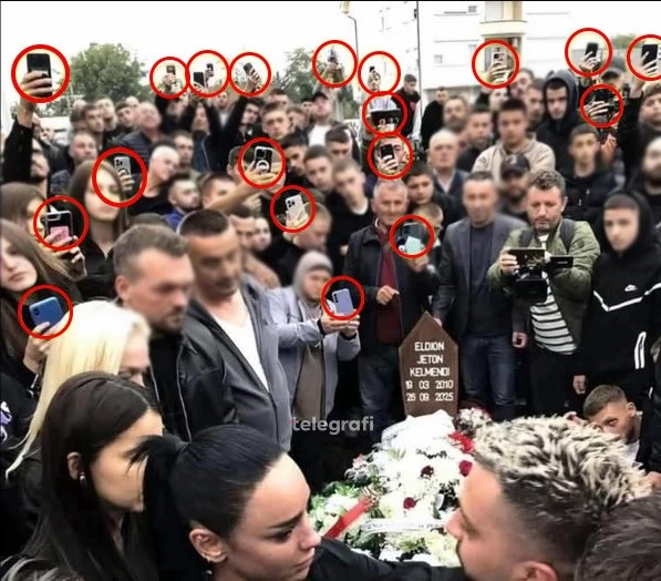 Në një fotografi të publikuar nga ceremonia, shihet qartë se dhjetëra persona, në vend që të respektonin privatësinë dhe dhimbjen e familjes, mbanin celularët e tyre në duar duke filmuar apo fotografuar këtë moment.
