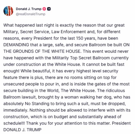 Në një postim në Truth Social, presidenti amerikan pretendoi se incidenti nuk do të kishte ndodhur nëse salla e ballove që është në ndërtim e sipër në anën lindore të Shtëpisë së Bardhë do të ishte përfunduar tashmë.