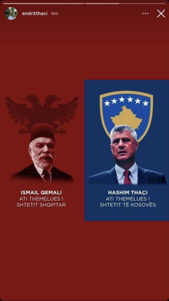 Djali i ish-presidentit të Kosovës, Endriti në 112 vjetorin e Pavarësisë së Shqipërisë ka publikuar një foto përmes të cilës tregon se Ismail Qemalit dhe Hashim Thaçi janë figura që shpallen pavarësinë e dy shteteve.