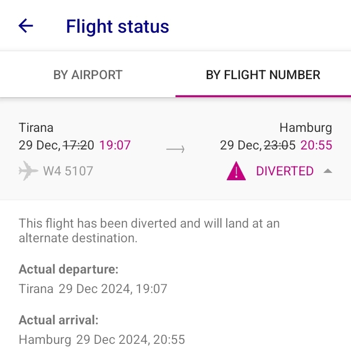 Fluturimi W4 5107 që operohet nga Wizz Air Malta, u nis nga aeroporti i Tiranës jo në orën 17.20 sipas planifikimit, por në 19.07.