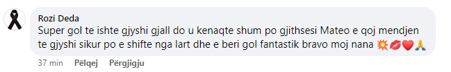 “Super gol të ishte gjyshi gjallë do të kënaqej shumë, por gjithsesi Mato e çoj mendjen te gjyshi sikur po e shihte nga lart dhe e bëri gol fantastik. Bravo moj nana!”, shkruan ajo krah komenteve të lajmit të newsport.al