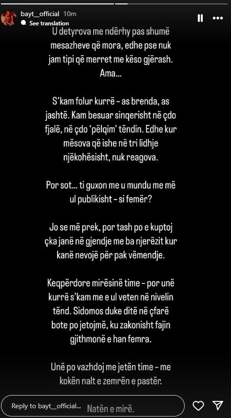 Përmes një postimi të gjatë në rrjetet sociale, ajo vendos të thyejë heshtjen, duke sqaruar anën e saj dhe duke i dhënë një përgjigje të qartë komenteve që janë bërë së fundmi.