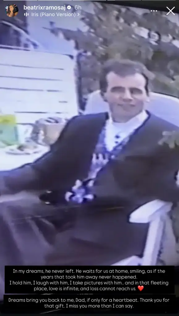 ”Në ëndrrat e mia, ai nuk iku kurrë. Na pret në shtëpi, duke buzëqeshur, sikur vitet që e morën larg të mos kishin ndodhur kurrë. E përqafoj, qesh me të, bëj foto me të… dhe në atë vend të çastit, dashuria është e pafundme dhe humbja nuk mund të na prekë. Ëndrrat më sjellin përsëri te ti, baba, qoftë edhe vetëm për një rrahje zemre. Faleminderit për këtë dhuratë. Më mungon më shumë sesa mund ta them me fjalë”.