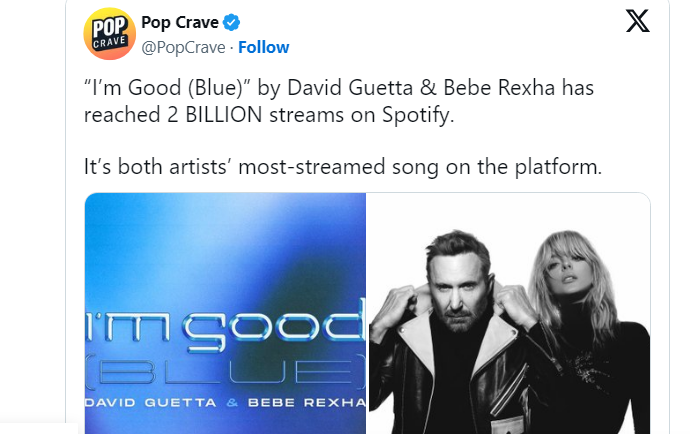 Hiti global “I’m Good (Blue)” nga David Guetta dhe Bebe Rexha ka arritur një tjetër sukses të jashtëzakonshëm, duke tejkaluar shifrën e dy miliardë dëgjimeve në Spotify. Kjo këngë, e publikuar në vitin 2022, shpejt u bë një nga hitet më të mëdha të muzikës elektronike.