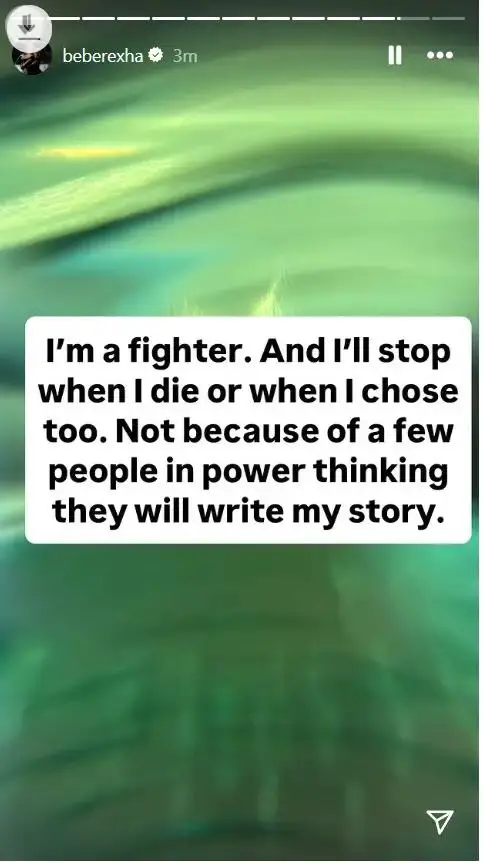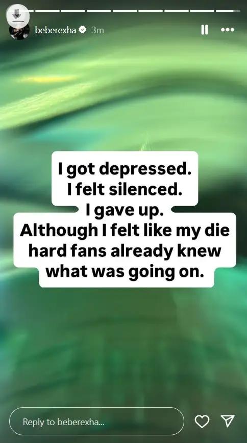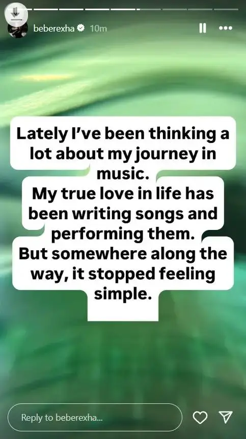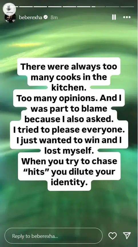 Në një seri postimesh në InstaStory, Bebe flet pa filtra për rrugëtimin e saj, duke zbuluar për herë të parë pasiguritë, presionin dhe padrejtësitë me të cilat është përballur gjatë karrierës së saj. “Shkrimi i këngëve ka qenë dashuria ime më e madhe, por në një moment, gjithçka u bë tepër e ndërlikuar,” shprehet ajo, duke treguar se suksesi shpesh shoqërohet me humbjen e kontrollit mbi artin dhe vetveten.