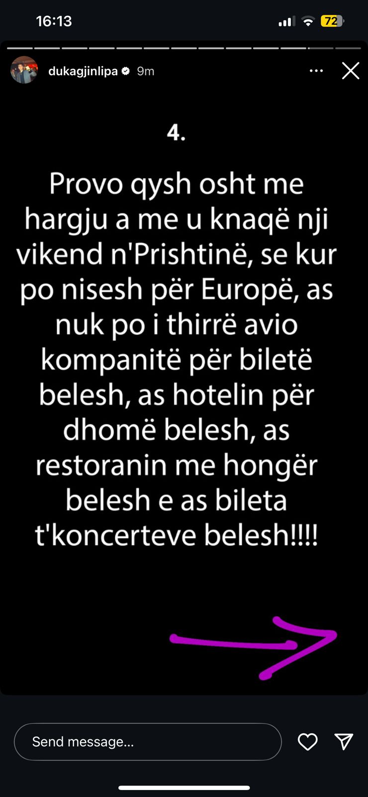 Në një tjetër mesazh, ai ironizon faktin se në vend që të ftojnë miqtë evropianë për të përjetuar Kosovën, njerëzit shpenzojnë energji për të kërkuar bileta “belesh”, duke harruar që për çdo gjë tjetër në Evropë paguajnë plotësisht.