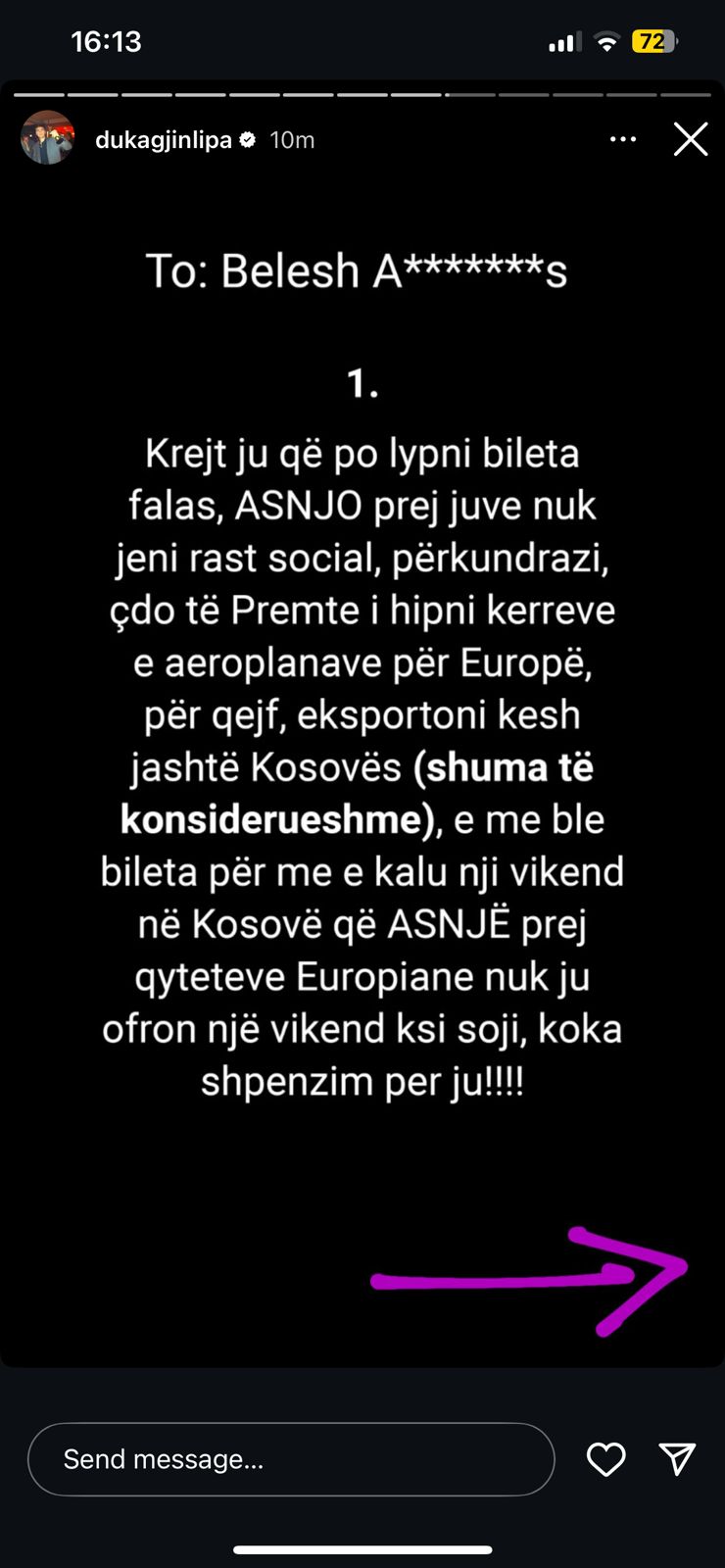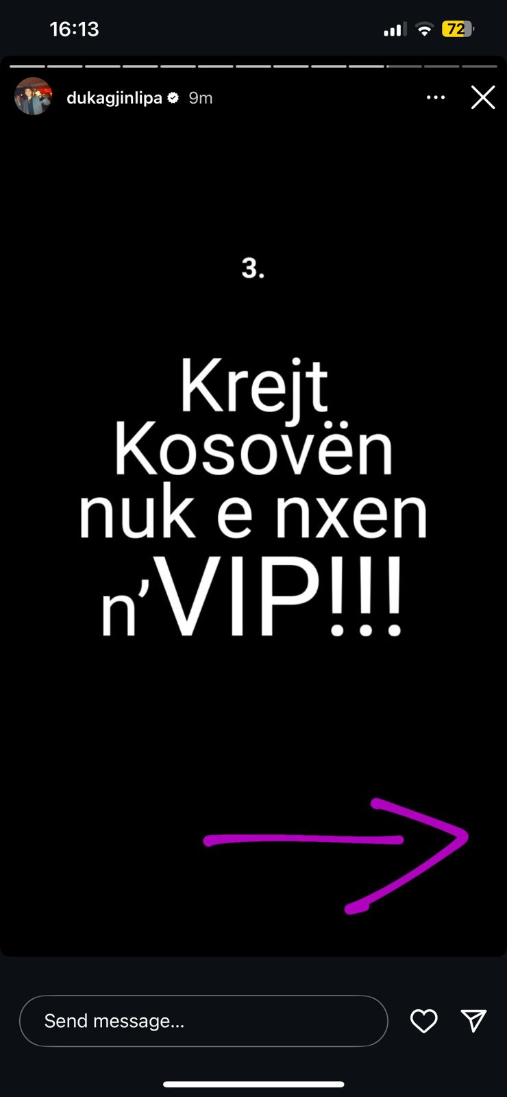 Reagimi i tij kulmon me një mesazh të thjeshtë por të qartë: “Krejt Kosovën nuk e nxen n’VIP!!!”