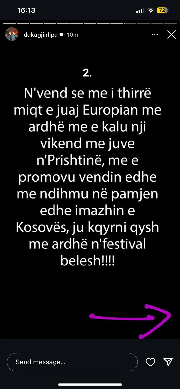 “ASNJO prej jush nuk jeni rast social. Çdo të Premte hipni në aeroplan për Evropë, për qejf, eksportoni kesh jashtë Kosovës, e kur vjen puna me ble bileta për festival – ju doket shpenzim,” shkruan ai, duke theksuar se një vikend në Prishtinë ofron përjetime që nuk i ofron asnjë qytet evropian për të njëjtin çmim.