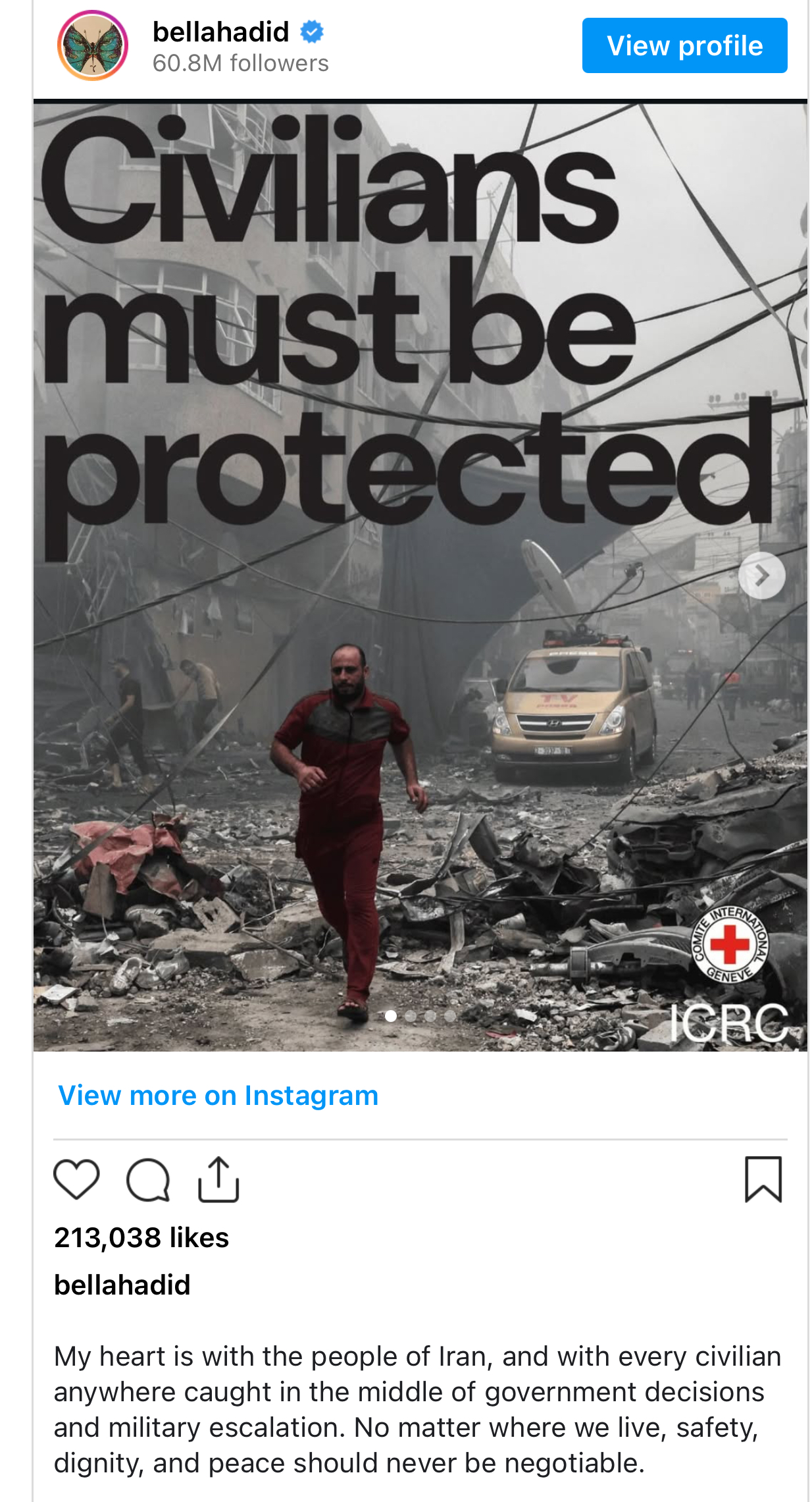 Bella Hadid ka shprehur solidaritet me popullin e Iranit përmes një postimi në rrjetet sociale, duke reaguar ndaj sulmeve të fundit dhe situatës së tensionuar në vend.
