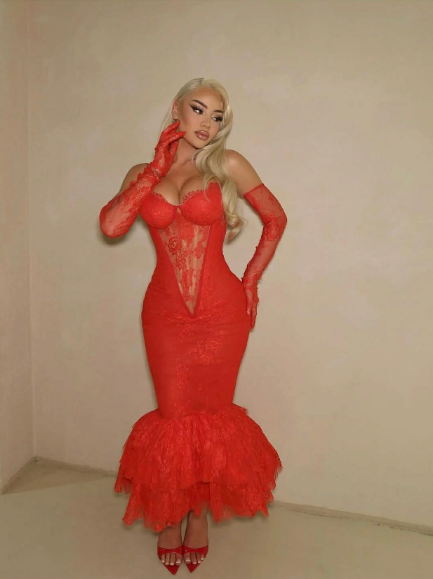 E veshur me fustan të kuq e të ngushtë, Benita nuk i lë vend shumë imagjinatës.