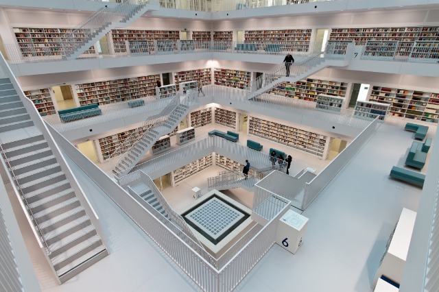 Biblioteka e Shtutgartit, Gjermani – Kjo ndërtesë nëntëkatëshe në formë kubi përmban një nga bibliotekat më mbresëlënëse në botë. Është projektuar nga Eun Youn Yi dhe dallohet për dizajnin e saj modern dhe futurist .