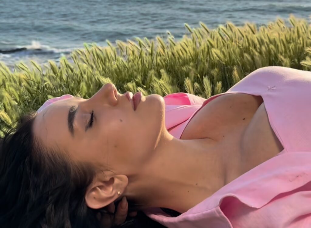 E shtrirë mbi barin e gjelbër me pamje nga deti dhe e veshur me një këmishë rozë të hapur, Bora duket në harmoni të plotë me natyrën.