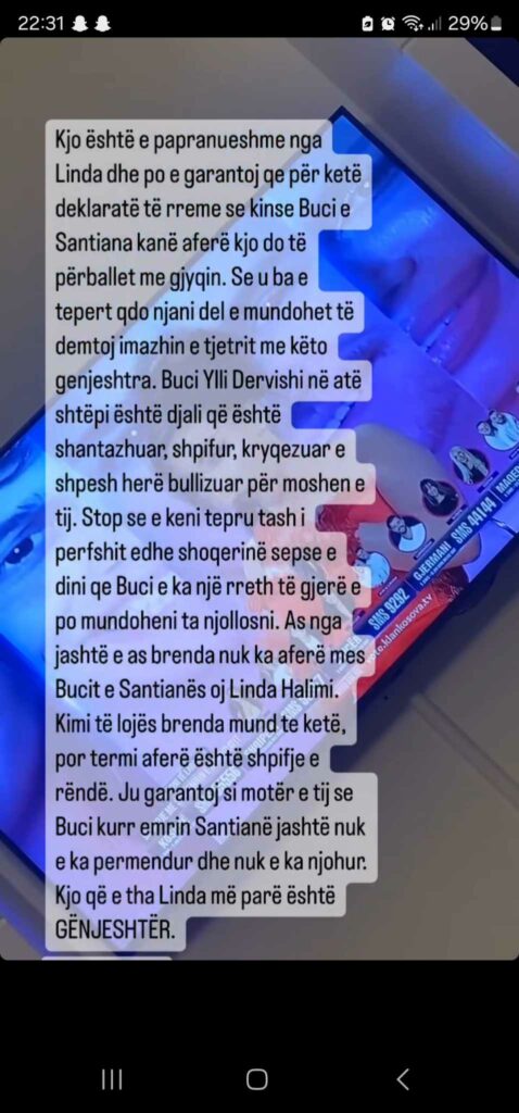 “Kjo është e papranueshme nga Linda dhe po e garantoj qe për ketë deklaratë të rreme se kinse Buci e Santiana kanë aferë kjo do të përballet me gjyqin. Se u ba e tepert qdo njani del e mundohet të demtoj imazhin e tjetrit me këto genjeshtra. Buci Ylli Dervishi në atë shtëpi është djali që është shantazhuar, shpifur, kryqezuar e shpesh herë bullizuar për moshen e tij. Stop se e keni tepru tash i perfshit edhe shoqerinë sepse e dini qe Buci e ka një rreth të gjerë e po mundoheni ta njollosni. As nga jashtë e as brenda nuk ka aferë mes Bucit e Santianës oj Linda Halimi. Kimi të lojës brenda mund te ketë, por termi aferë është shpifje e rëndë. Ju garantoj si motër e tij se Buci kurr emrin Santianë jashtë nuk e ka permendur dhe nuk e ka njohur. Kjo që e tha Linda më parë është GËNJESHTËR”, ka shkruar ajo.