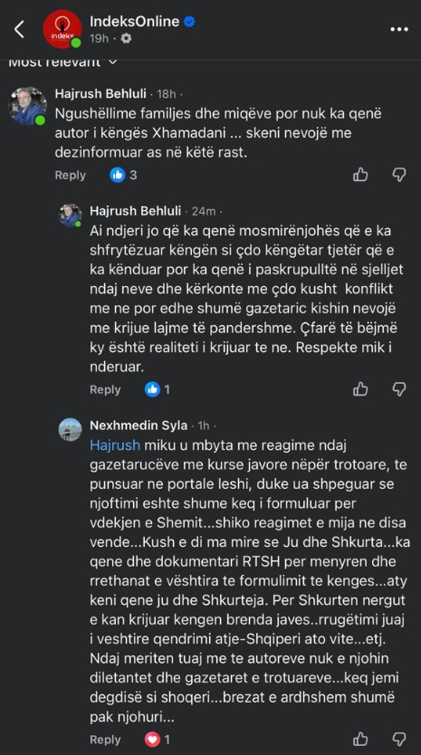Në një postim të portalit “IndeksOnline” në Facebook lidhur me vdekjen e këngëtarit, Hajrush Behluli ka ndërhyrë përmes komenteve për të saktësuar atë që ai e quan “dezinformim” lidhur me këngën ikonike