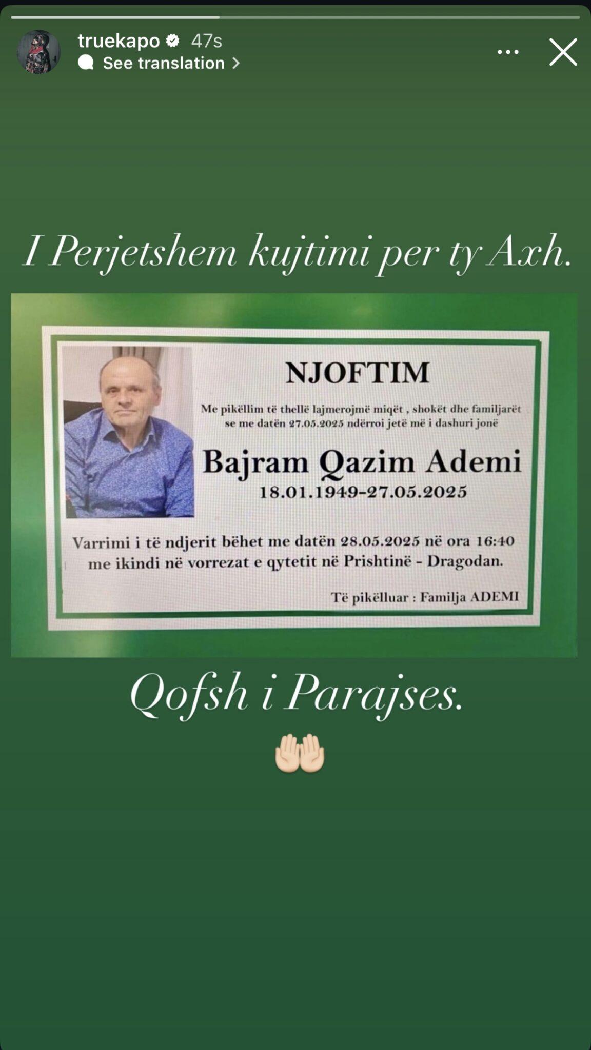 “Sot e varrosëm axhën tim të vetëm, ndjeva nevojë me ju falenderu nga zemra për pjesëmarrjen e madhe në varrim poashtu për ngushëllimet e shumta në këto kohë të vështira për mua dhe familjen,” shkruan ai në një foto të publikuar nga varreza.