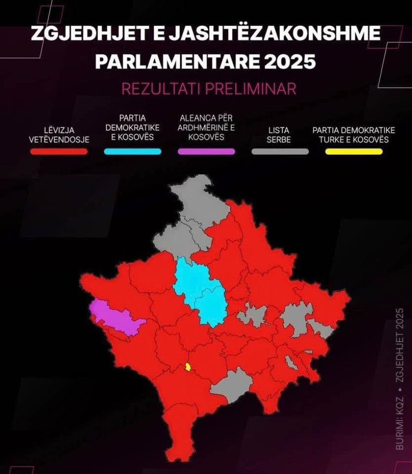 Lajme Harta e KosovĂ«s bĂ«het âe kuqeâ nga fitorja e VetĂ«vendosjes, ja partitĂ« e tjera đ 29.12.2025 đ 0