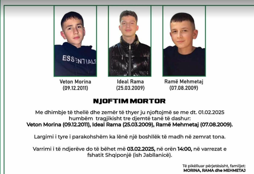 Lajme Sot varrosen tre fëmijët që humbën jetën tragjikisht në Jabllanicë të Gjakovës 📅 03.02.2025 👁 2