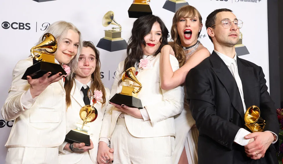 Boygenius fitoi tre trofe rock dhe alternativë, ndërsa një nga anëtarët e tyre, Phoebe Bridgers (majtas), fitoi gjithashtu performancën më të mirë të dyshes/grupit pop. Treshes iu bashkuan në dhomën e fituesve një Taylor Swift fitimtare dhe producenti i saj Jack Antonoff.