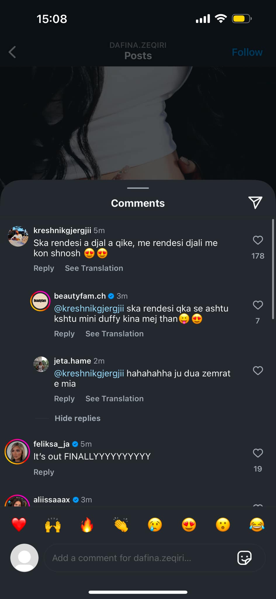Ndërkohë partneri i saj, Kreshnik Gjergji ka marr vëmendje me komentin që la në postimin e Dafinës.