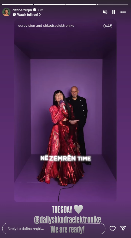 Përmes një postimi në InstaStory, Dafina ka shpërndarë një video të performancës së grupit, duke shoqëruar atë me fjalët: “Të martën, jemi gati”, në shenjë mbështetjeje dhe entuziazmi për daljen e tyre në skenën e madhe.