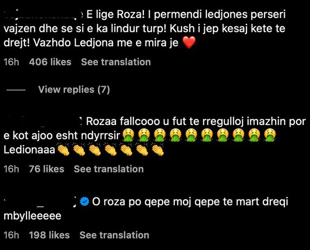 Ndërkohë, më poshtë do gjeni vetëm dy prej shumë (po shumë komenteve) kundër Rozës, madje edhe që e ofendojnë, ndërsa ka edhe epitete ndaj saj, që nga “e ligë” deri tek ajo që nuk mund t’i përfshijmë në një artikull.