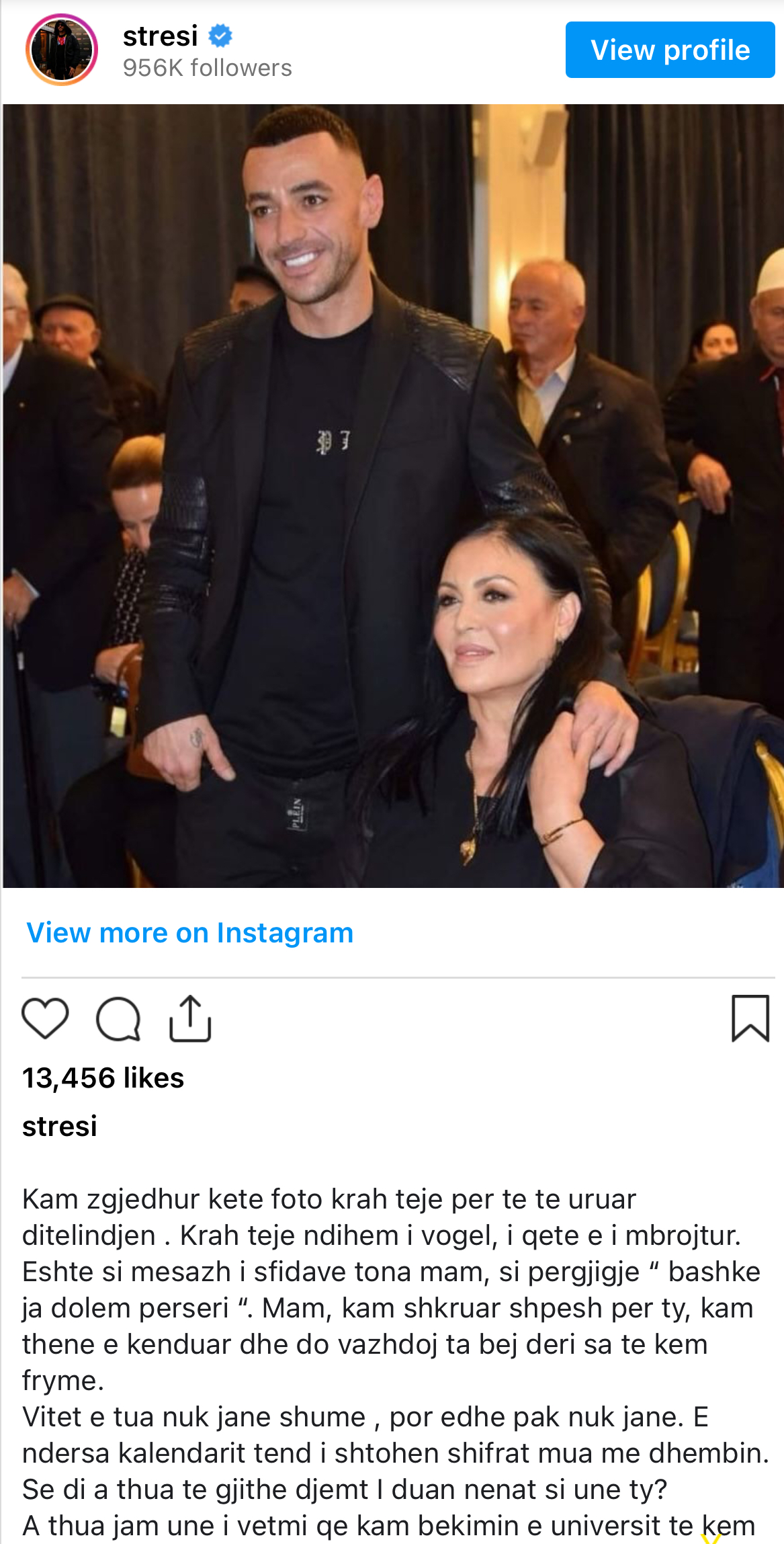 Në mesazhin e tij, Stresi e quan nënën “krahu tjetër i ditëlindjes” dhe “krahu i vogël i ditës, i mbrojtur dhe mbrojtës”, duke treguar se ajo është figura që e ka udhëhequr në çdo moment të jetës. Reperi pranon se vitet e fundit kanë qenë të mbushura me sfida, por nënën e përshkruan si forcën që i ka kthyer gjithmonë dhimbjen në buzëqeshje.